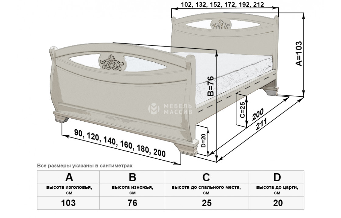 Кровать Эльза имеет две идентичные спинки, отличающиеся аккуратной изогнутостью, декоративными углублениями и цветочными узорами. Изделие, которое можно купить по специальной цене в нашем интернет-магазине, оснащено устойчивыми ножками, защищающими напольное покрытие от повреждений. Осуществляется доставка на дом по Ижевску и Удмуртской Республике.| Размер | Цена | |